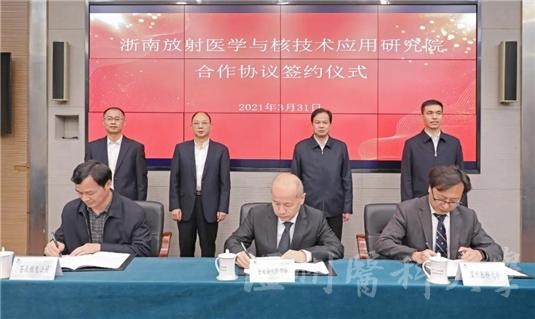 3月31日下午,温州医科大学与苍南县人民政府、中广核苍南核电公司共建浙南放射医学与核技术应用研究院合作签约仪式在苍南举行。校党委书记吕一军,苍南县县委书记陈永光,中广核苍南核电公司党委委员、副总经理黄维德出席仪式,苍南县县长张本锋主持仪式。