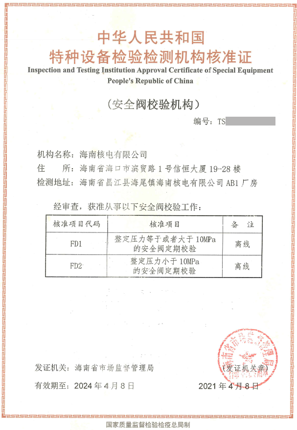 2021年4月12日,海南核电正式获得由海南省市场监督管理局颁发的《中华人民共和国特种设备检验检测机构核准证》,核准项目为高、低压安全阀定期校验(FD1、FD2),成为中国核电各成员单位中第一家取得安全阀特种设备检验检测机构资质的企业。