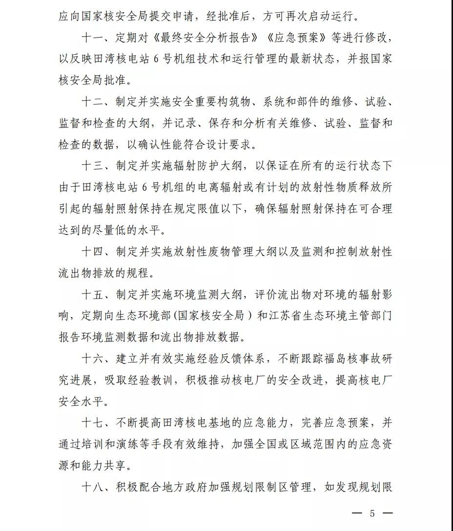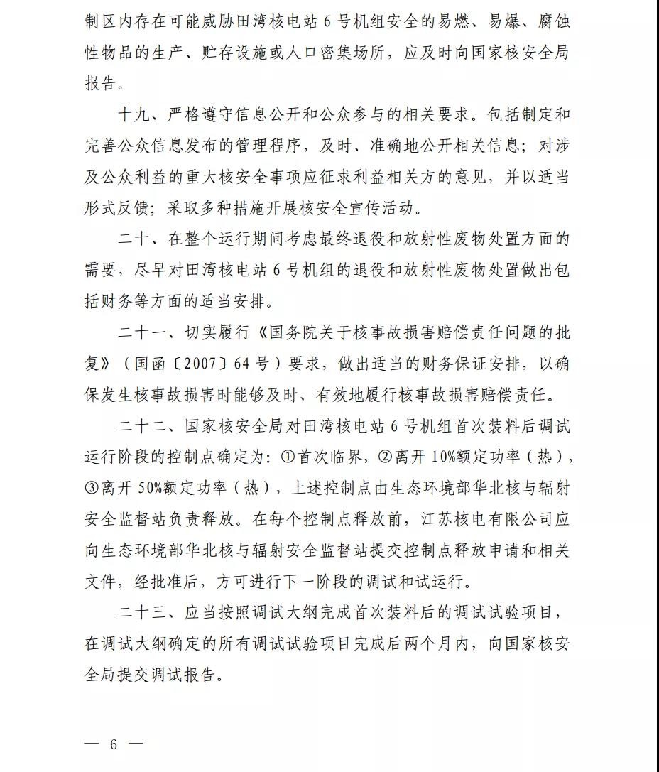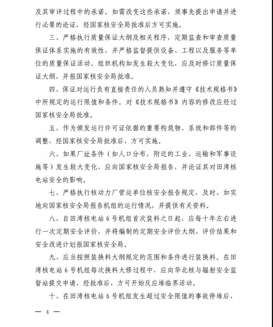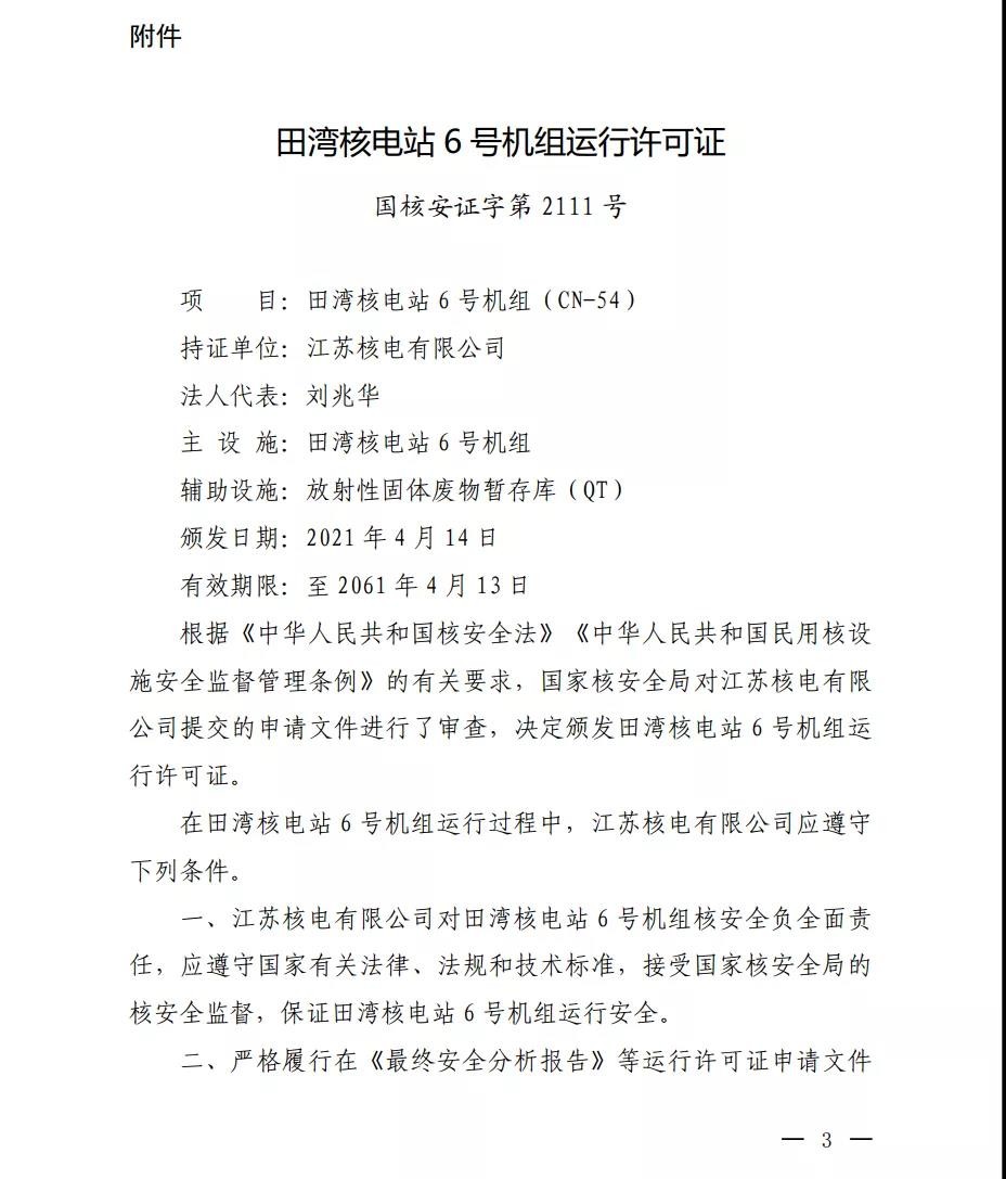 根据《中华人民共和国核安全法》《中华人民共和国民用核设施安全监督管理条例》的有关要求,我局对你公司提交的田湾核电站6号机组运行许可证申请书及相关文件进行了审查,认为该申请是可以接受的,决定颁发田湾核电站6号机组运行许可证。