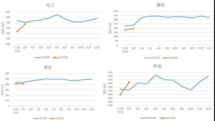 1-3月份,化学原料制品、非金属矿物制品、黑色金属冶炼和有色金属冶炼四大高载能行业用电量合计4293亿千瓦时,同比下降5.0%,增速比上年同期回落7.8个百分点;合计用电量占全社会用电量的比重为27.3%。其中,化工行业用电量1035亿千瓦时,同比下降5.7%,增速比上年同期回落8.7个百分点;建材行业用电量564亿千瓦时,同比下降18.9%,增速比上年同期回落26.8个百分点;黑色金属冶炼行业用电量1272亿千瓦时,同比下降3.2%,增速比上年同期回落6.0个百分点;有色金属冶炼行业1422亿千瓦时,同比增长0.9%,增速比上年同期提高0.5个百分点。