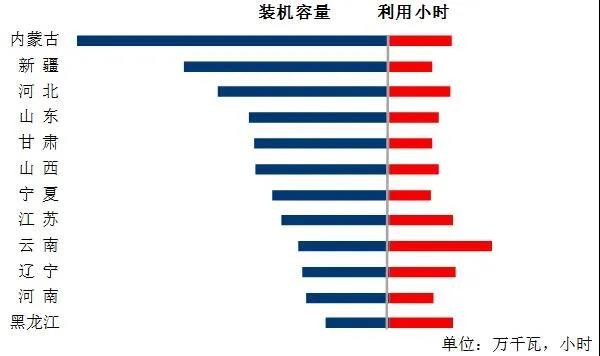 图5 1-3月份风电装机较多省份风电装机容量和设备利用小时