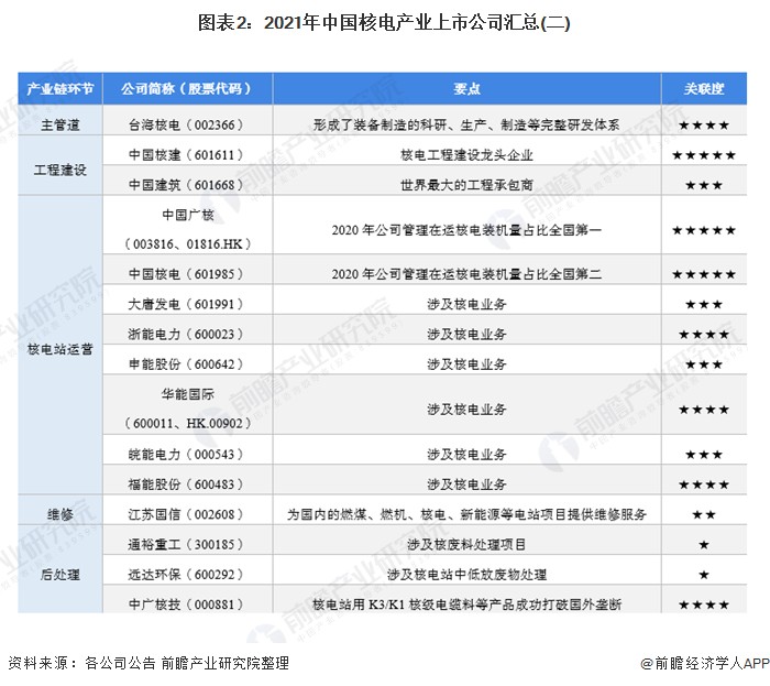 核电是我国能源供应体系的重要分支,也是新能源的重要组成部分。目前,我国核电产业的上市公司数量较多,分布在各产业链环节。其中,涉及核电站运营的上市公司包括:中国广核、中国核电、大唐发电等。