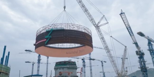 漳州核电2号机组反应堆厂房钢衬里模块三是漳州核电起吊的第九个安全壳钢衬里模块,总起吊重量约为187.22t,由筒体4段、5段组成,高度为9.96m,直径为46.812m,吊装就位后钢衬里筒体顶标高达到19.955m。