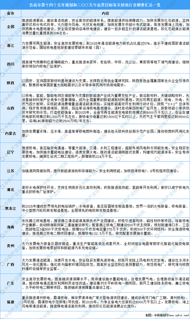 全国各地积极促进核电行业发展,中商产业研究院整理了全国各省市“十四五”发展规划建议/纲要中有关核电行业发展相关内容,以供参考: