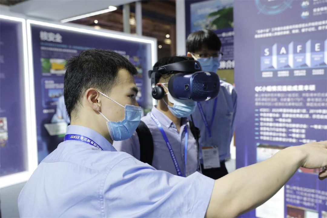 为了让观众对秦山核电印象更深刻,特设置了实物互动桌,工业安全VR游戏体验,还有防护服试穿等互动环节。