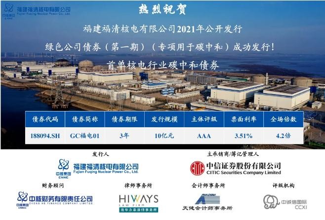 5月10日,福清核电发行核电行业首单“碳中和”绿色公司债券。作为年度第一期绿色公司债券,本期债券规模10亿元,期限3年,票面利率3.51%。