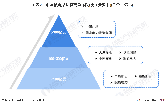 核电行业依据企业的注册资本划分,可分为3个竞争梯队。其中,注册资本大于300亿元的企业有中国广核、国家电力投资集团;注册资本在100-300亿元之间的企业有:中国核电、大唐发电、华能国际、浙能电力;其余企业的注册资本在100亿元以下。