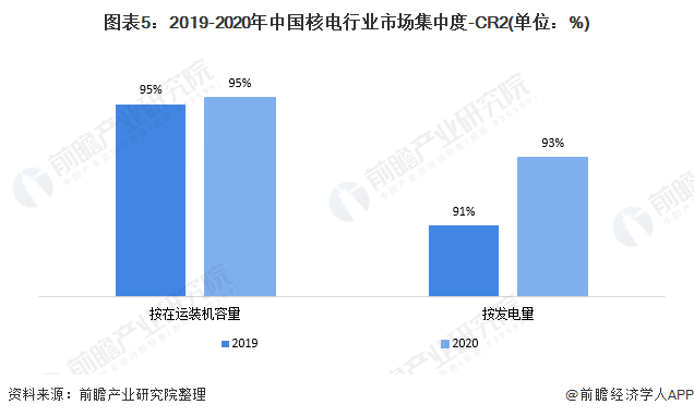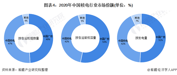 目前,中国核电行业两大龙头企业分别是中国核电、中国广核。2020年,按在运机组数量来看,中国广核的市场份额达49%,中国核电的市场份额达47%;按在运装机容量来看,中国广核的市场份额达53%,中国核电的市场份额达42%;按发电量来看,中国广核、中国核电的市场份额分为为51%、42%。