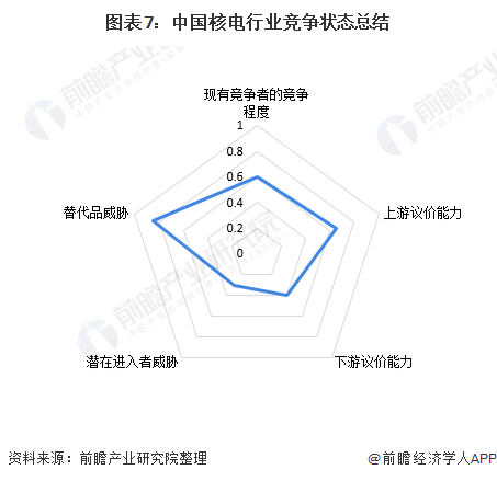 从五力竞争模型角度分析,目前,我国核电行业属于新能源行业,替代品威胁较大;现有竞争者数量不多,但市场集中度较高;上游供应商一般为核燃料、核岛设备、以及工程建设等企业,议价能力适中,而下游消费市场主要是电力局,议价能力较弱;同时,因行业存在严格的准入资质以及资金、技术门槛较高,潜在进入者威胁较小。