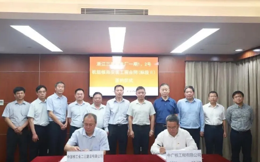中广核工程公司施工管理中心主任陈李华、中核二三副总经理、总工程师范凯代表双方签署了浙江三澳核电厂一期工程1、2号机组核岛安装工程(标段Ⅱ)合同。