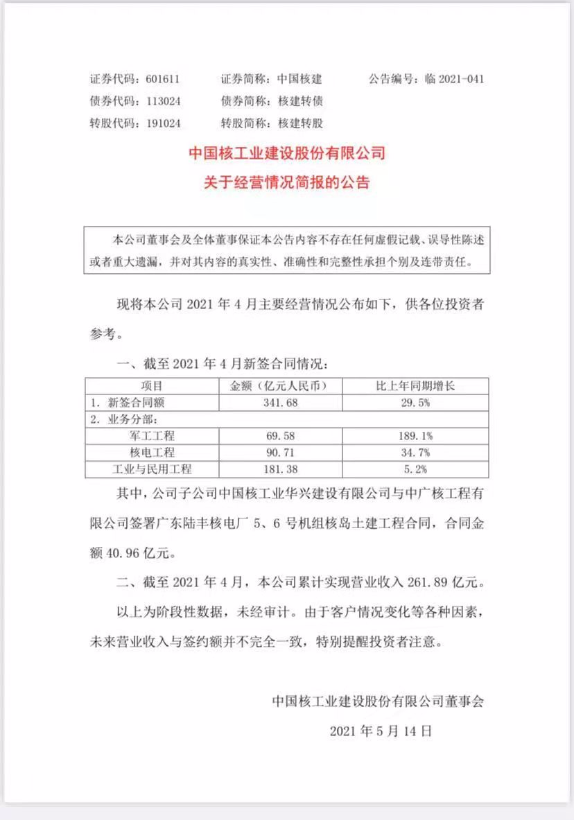 据中国核建公告显示其子公司中国核工业华兴建设有限公司与中广核工程有限公司签署广东陆丰核电厂 5、6 号机组核岛土建工程合同,合同金额 40.96 亿元。