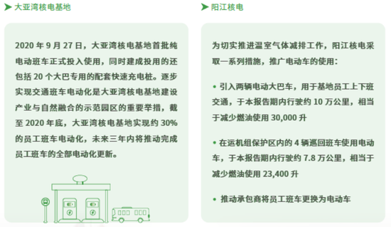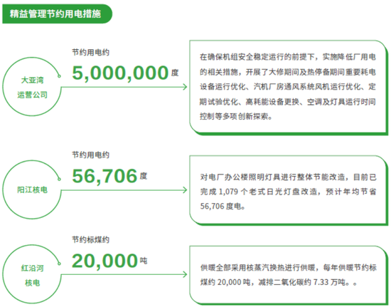 各核电站均设立节能管理小组负责统筹协调各部门的节能相关工作,并持续优化运行方式,停运不必要运行的设备,淘汰高耗能设备;通过技术改造,优化设备用能效益,加强节能降碳;张贴空调、电灯标签,加强办公场所用电管理;传播节能理念,倡导员工低碳出行。