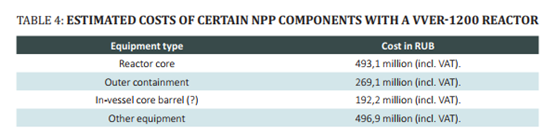 Rosatom的负责人Alexey Likhachev在之前与总统普京的会晤中表示:“俄罗斯在国外核电建设的队伍相比其它国家是最多的。”在2020年,Rosatom表示,新冠疫情对其国外项目的影响很小。 在过去的十年中,Rosatom以巨额贷款的形式向其他国家出口核电,以推广俄罗斯的核电技术。增加俄罗斯核电技术在国际市场的份额是Rosatom的四个主要战略目标之一。截至2020年末,Rosatom已在国外12个国家有35座反应堆在建或完工。 Rosatom目前在向国外潜在客户推介VVER-1200机型。VVER-1200原本被称为AES- 2006,是俄罗斯主力机型VVER-1000的升级版。第一台VVER-1200在国内的Novovoronezh-2 核电站建造,并于2017年2月全面投入商业运行。 Rosatom一般不公布单堆造价,但是Interfax于2017年发布的在Ostrovets核电站建造的VVER-1200机组预计成本提供了逐项成本的一些参考,如下面的表4所示。(1卢布=0.087元人民币)