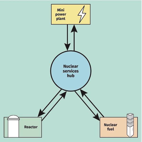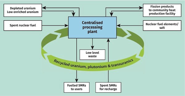 中心和卫星概念允许通过复制和大规模制造来节省成本,而废物管理的集中化意味着回收燃料和处置废物的复杂操作的成本可以分摊到大量反应堆上。