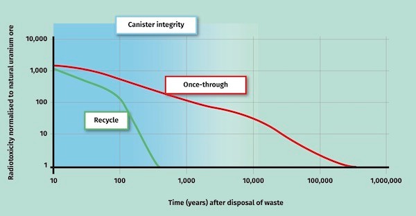 核过程中不可还原的废物(主要是裂变产物而不是次要的锕系元素)只是乏燃料的一小部分,而这一部分也是产生大部分麻烦的热量的原因。当使用结束时,裂变产物部分本身可以被允许留在原处而无需进一步的人工干预。这是因为在物理遏制(例如罐)失效之前,危害将衰减到基本无害的水平。如果分离出发热部分,则可能会使用热量。
