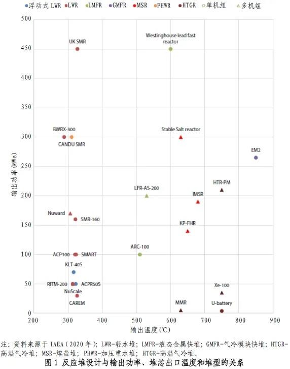 当今的SMR之所以受到关注,不仅因为其尺寸小,更是由于小尺寸带来的安全性、交付模型和商业案例等。商业化进程最快的小堆设计均基于已经积累数十年运行和监管经验的大型轻水堆设计。有一些设计正在建造中(如阿根廷的CAREM、中国的ACPR50S)或正在商业运行中(如俄罗斯的KLT-40S)。这些技术是世界范围内运行的二代和三代/三代加反应堆的小型进化变体,受益于其数十年的运行和监管经验。图1是某些反应堆设计与输出功率、堆芯出口温度和堆型的关系。最成熟的第四代设计是金属冷却和气体冷却系统,采用这些设计的一些机组目前正在运行或建造中。