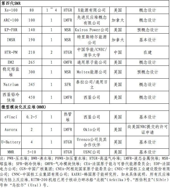 SMR的设计可以有多种分类方式,此次OECD报告将SMR分为以下五类:①单机组轻水堆-SMR:采用成熟的轻水堆技术和燃料的独立机组,可替代小型化石燃料机组或部署为分布式发电机组;②多机组轻水堆-SMR:也采用轻水堆技术,可根据发电容量替代中型基本负载容量,也可以在分布式发电框架中运行;③可移动/可运输式SMR:目前采用轻水堆技术,目的是便于从一处转移到另一处,浮动堆属于此类别;④第四代(Gen IV)SMR:采用先进的非轻水堆技术,包括第四代核能系统国际论坛(GIF)认可的设计概念;⑤微型模块化反应堆(MMR):装机容量小于10 MWe的设计,通常能够半自主运行,相对于较大的SMR,其运输能力得到改善。MMR主要用于偏远地区的离网运行。这些SMR设计的技术成熟度(TRL)和许可成熟度(LRL)各不相同。