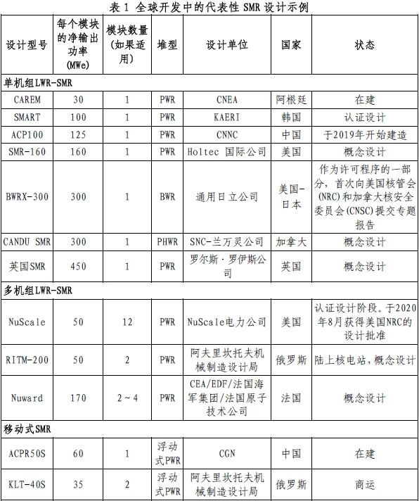 目前,至少有72个SMR概念正处于不同的开发阶段(IAEA,2020年),较2018年增加了40%(IAEA,2018年)。表1列举了国际上处于开发阶段的代表性SMR,其中大约一半的设计概念基于LWR技术,另一半基于第四代概念。虽然“SMR”一词在世界各地被用来指所有小型反应堆设计,但主要类型的SMR之间仍存在显著差异,特别是在设计模块化程度方面。