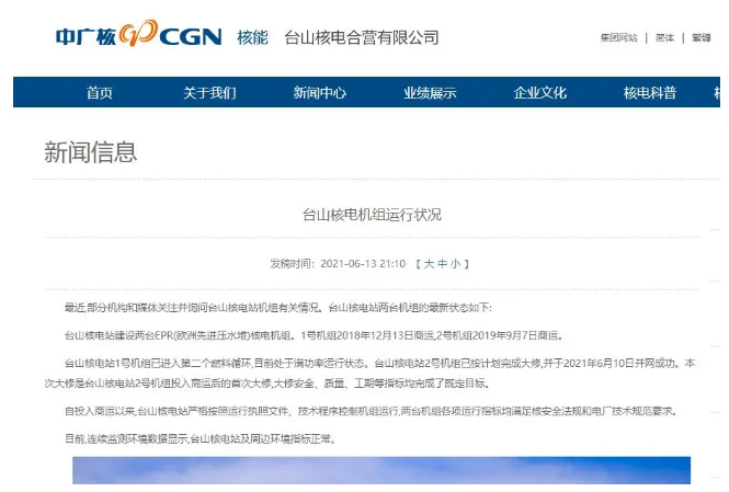 6月13日,中国广核集团台山核电合营有限公司网站发布“台山核电机组运行状况”称,最近,部分机构和媒体关注并询问台山核电站机组有关情况。台山核电站两台机组的最新状态如下: