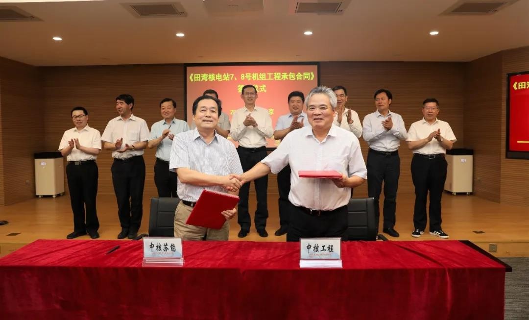 最后,陈劲主持田湾核电站7、8号机组和徐大堡核电厂3、4号机组工程承包合同签字仪式,徐鹏飞代表中核工程分别与中核苏能党委书记、董事长刘兆华和辽宁核电党委书记、董事长王秀启签署《田湾核电站7、8号机组工程承包合同》和《徐大堡核电厂3、4号机组工程承包合同》。
