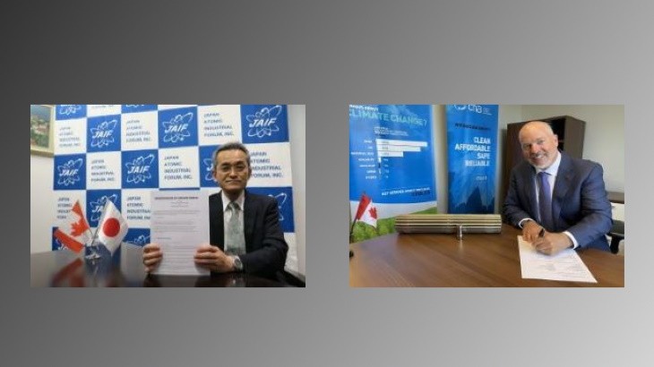 加拿大核协会 (CNA) 和日本原子工业论坛 (JAIF) 签署了一份谅解备忘录,以加强双方在推进核能开发、应用和部署以实现气候变化目标方面的合作。该谅解备忘录昨天由 CNA 总裁兼首席执行官 John Gorman 和 JAIF 总裁 Shiro Arai 签署。