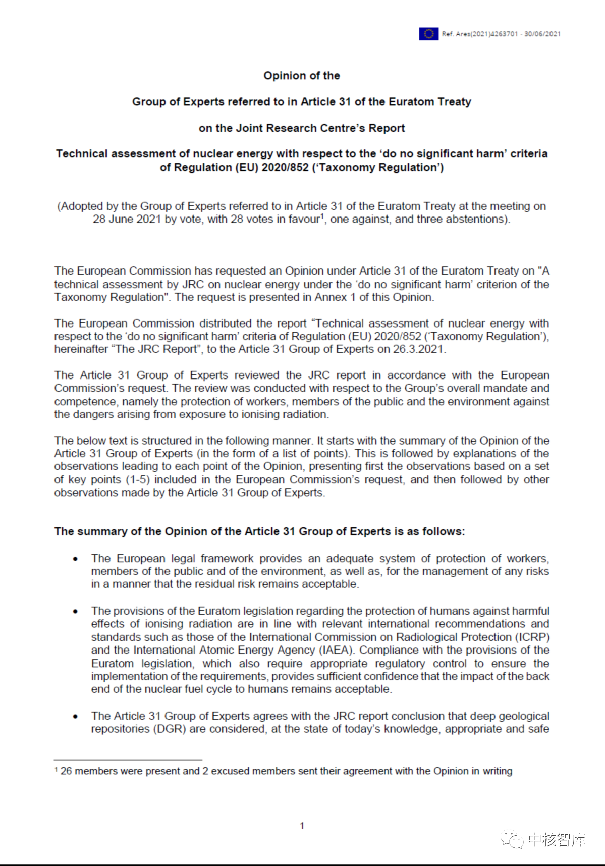 第31条专家组报告在总体上确认了联合研究中心报告中关于保护人类免受辐射照射、深层地质处置库是乏燃料管理方案、核能遵守欧盟各种监管框架等评价结果。