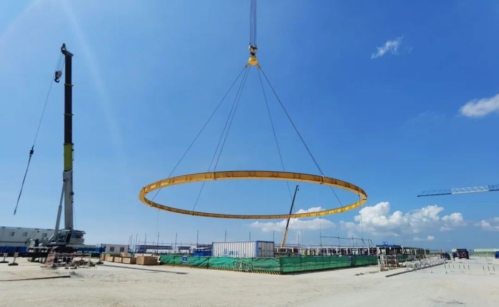 早上6点,现场吊装作业施工人员便开始连接钢丝绳,在现场风速符合安全条件之后,9:38正式起吊,1600吨履带吊将金黄色环形模块稳稳吊起,经过试吊、旋转、带载行走等一系列吊装程序,最后13:16安全稳妥、成功就位。