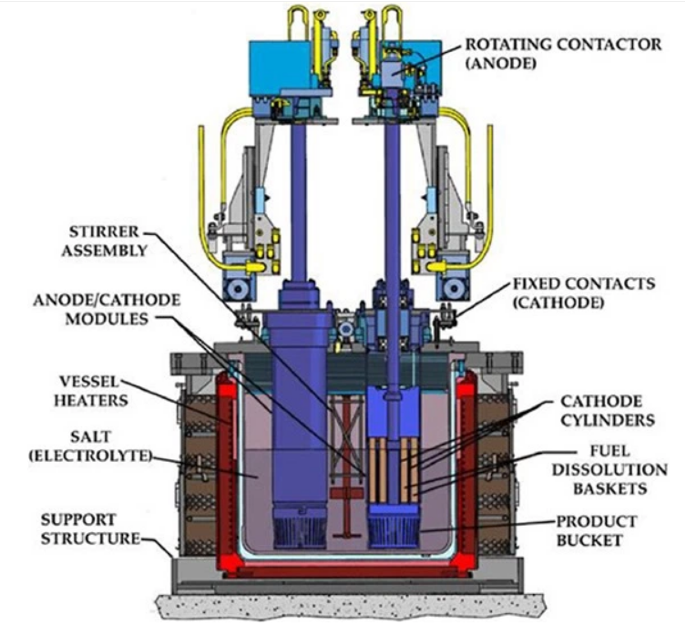 电解精炼工艺有助于降低先进堆核燃料的成本。热堆利用燃料的一小部分能量,而快堆与电精炼相结合,可以释放燃料中剩余的、未开发能量,同时减少废料的体积和放射性的寿期。
