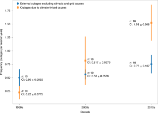 最终作者计算得出,与气候相关的平均停电频率,已从 1990 年代的 0.2 次 / 年,增加到了 2010 年代的 1.5 次 / 年。