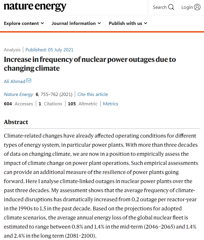 有关这项研究的详情,已经发表在近日出版的《自然能源》(Nature Energy)期刊上。原标题为《Increase in frequency of nuclear power outages due to changing climate》。