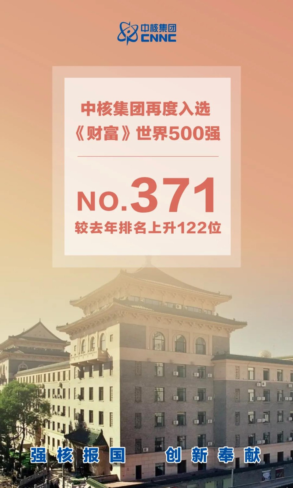 北京时间8月2日,美国《财富》杂志公布最新一期世界500强排名,中核集团再度入选,位列第371位,排名较去年大幅上升122位。