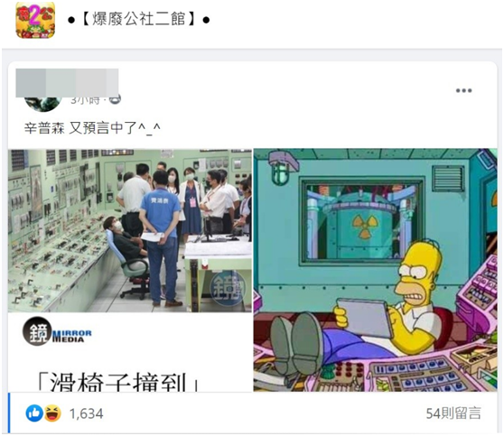 台湾“ETtoday新闻云”称,过去许多现实生活情节被美国知名喜剧动画片《辛普森一家》预言成真,包括特朗普宣布竞选、哈里斯就职穿搭等。没想到现在又“预言”台湾核二厂2号机跳机原因。对于一张椅子就让核二厂跳机的说法,台湾“ETtoday新闻云”称,不少台湾网友第一时间想到动画片《辛普森一家》故事情节,岛内论坛PTT及“爆废公社二馆”有网友笑称:“我是在看辛普森一家吗?”“预言只信辛普森”,“辛普森只是想画的很智障,没想到现实人员就真的很智障”,“辛普森一家演过了”,“辛普森都是真的”。