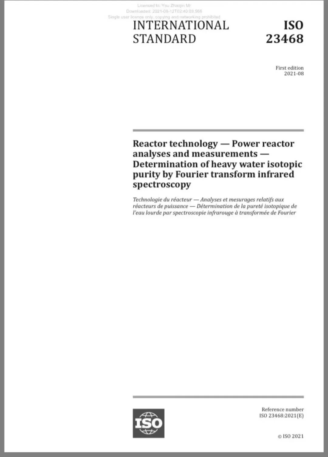 近日,从国际标准化组织ISO传来捷报,由秦山核电主导编制的国际标准ISO 23468《傅里叶红外光谱法测量重水浓度》于8月11日正式发布,该标准为国际核技术领域重水浓度的测量提供了最新的先进技术规范。