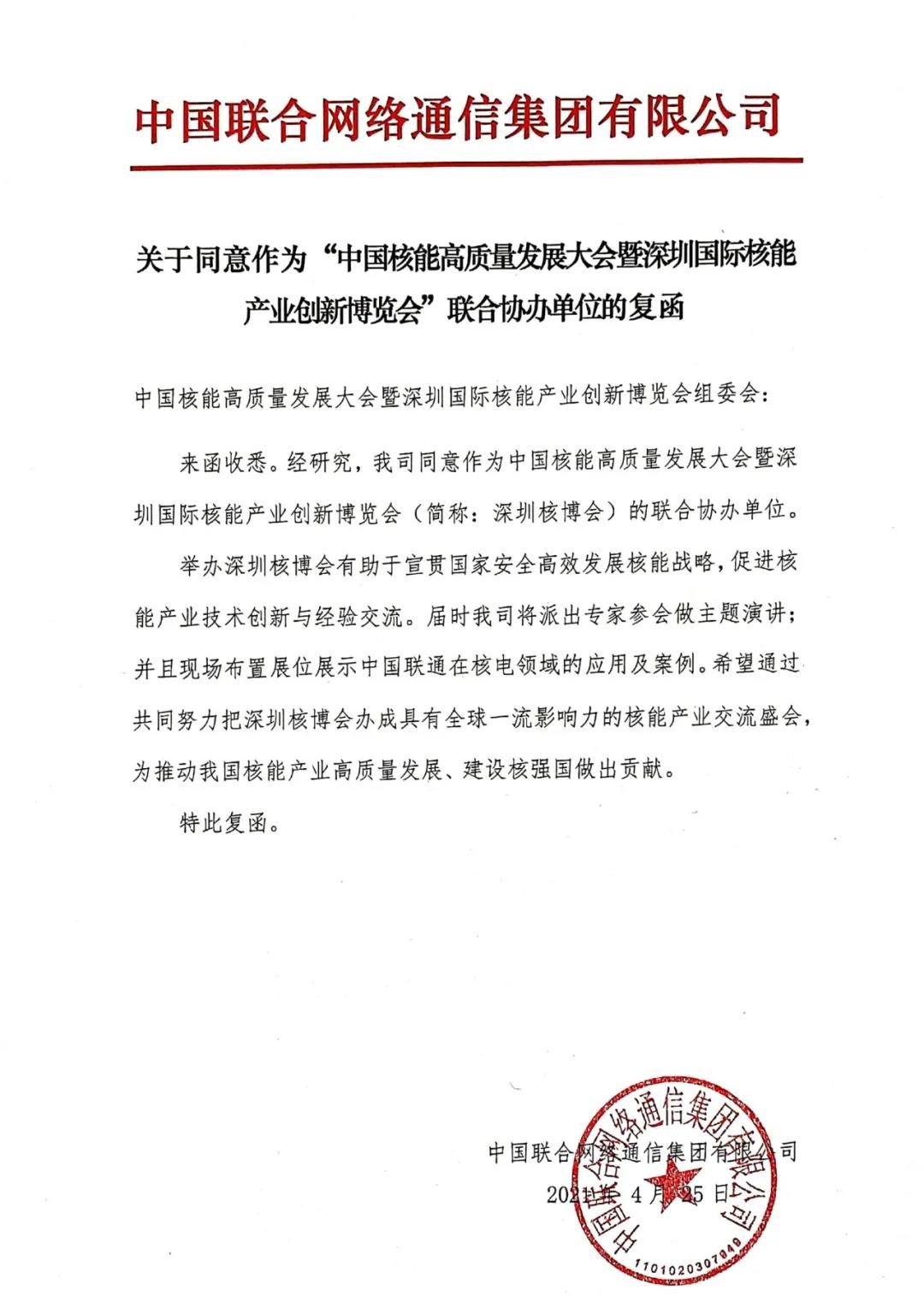 旨在宣贯国家安全高效发展核能战略,落实中央坚持聚焦能源数字化转型的重大需求,促进互联网+与核电融合发展,打造“5G+智慧核电”模式,推动我国核电产业高质量发展,为我国建设核电强国、能源强国贡献力量,中国联合网络通信集团有限公司(以下简称“中国联通”)同意作为2021深圳核博会联合协办单位。