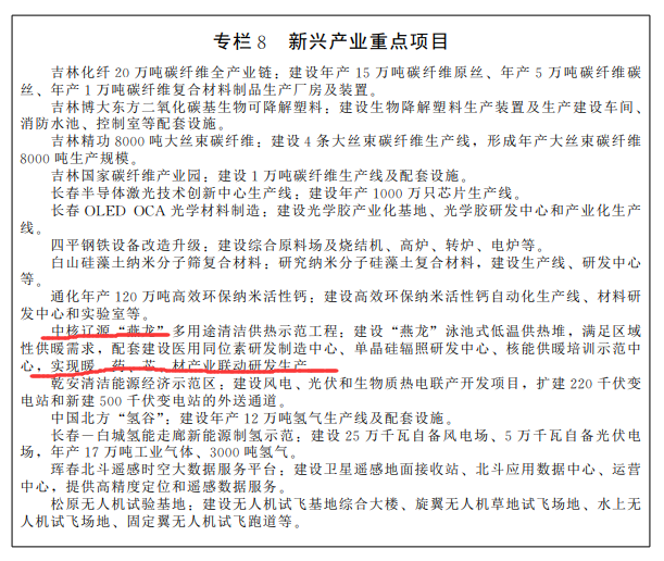 在省级“十四五”规划中,吉林省和山东省均将探索核能供暖列入未来5年工重点内容。山东省“十四五”规划提出,探索核能小堆供热技术研究和示范。吉林省“十四五规划”专栏8“新兴产业重点项目”明确表示,建设中核辽源“燕龙”多用途清洁供热示范工程,满足区域性供暖需求。