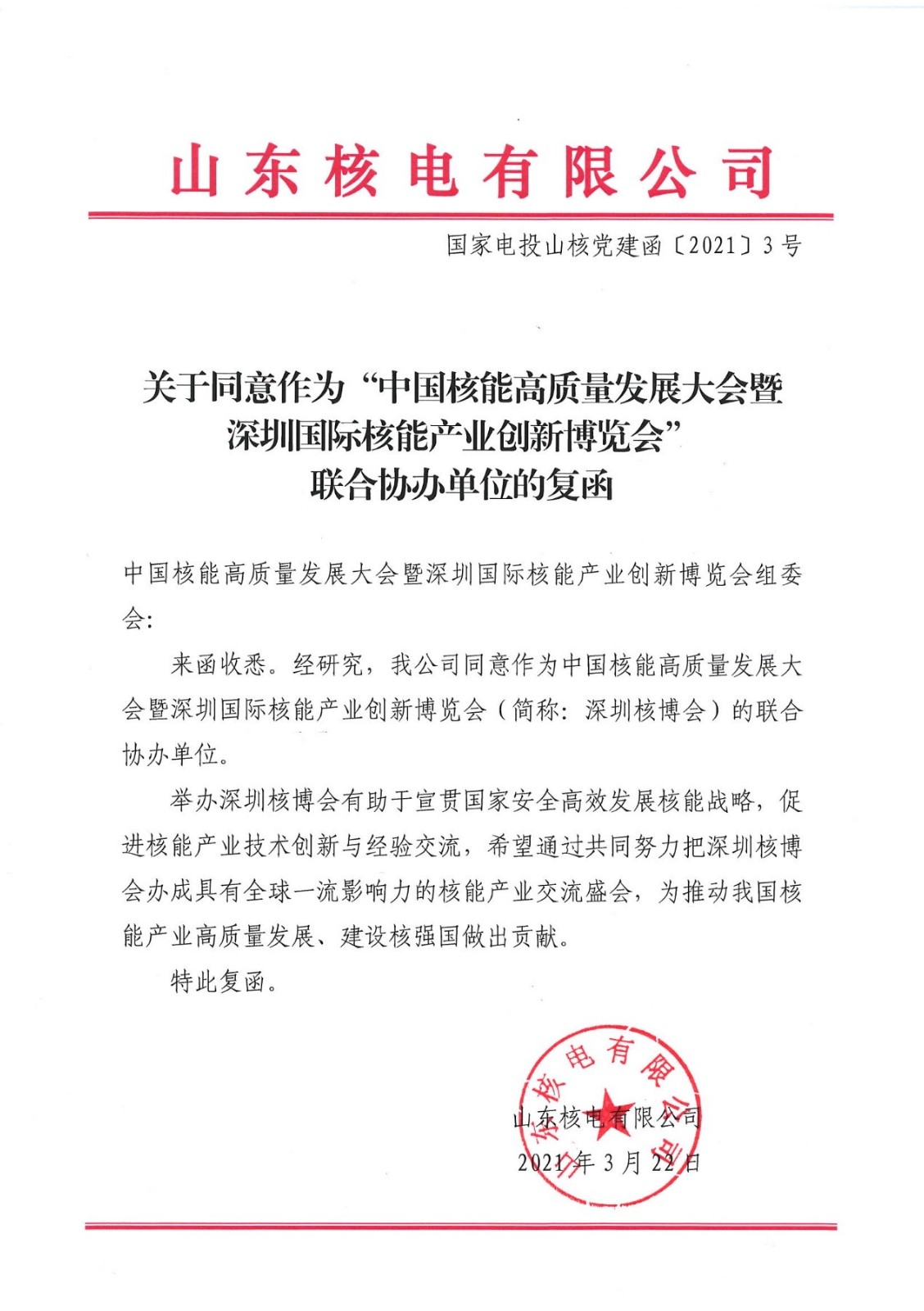 为推动我国核能产业高质量发展、建设核强国做出贡献,山东核电有限公司(以下简称“山东核电”)同意作为深圳核博会联合协办单位。
