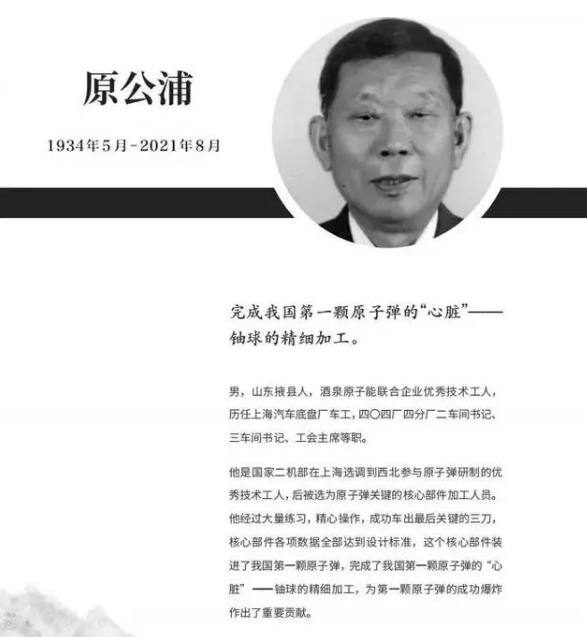 据悉,2021年8月22日6时57分,入选中国核工业功勋榜的技术工人代表、我国第一颗原子弹核心部件铀球的操刀人原公浦因病在上海逝世,享年87岁。原公浦曾被选为原子弹关键核心部件加工人员,为第一颗原子弹的成功爆炸作出了重要贡献。2020年1月15日,原公浦被授予中国核工业功勋奖章。