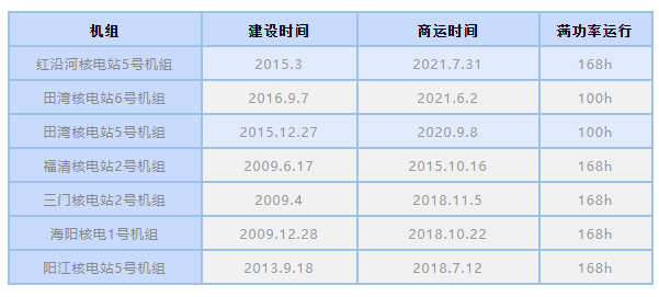下表搜集了最近几年核电站商运时间,从表中可以看出,通过168小时满功率试运行试验,是进入商业运营的必备条件之一。