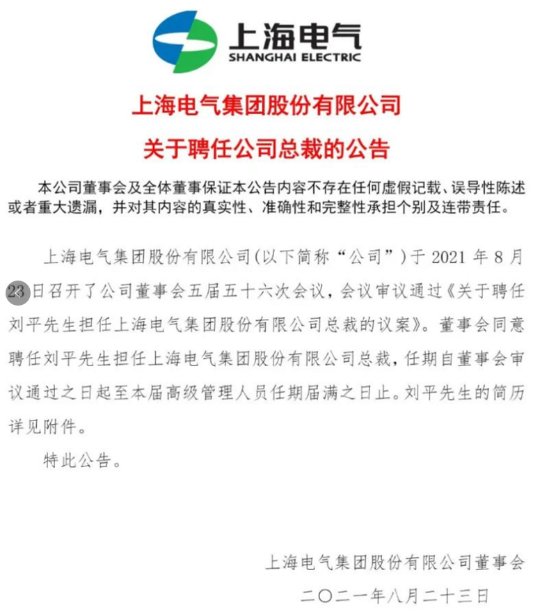 同日,上海电气召开了公司董事会五届五十六次会议,会议审议通过《关于聘任 刘平先生担任上海电气集团股份有限公司总裁的议案》。