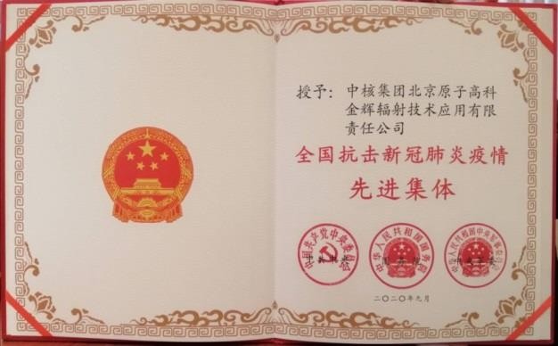 2020年9月8日,全国抗击新冠肺炎疫情表彰大会在人民大会堂召开,金辉辐射公司被党中央、国务院、中央军委授予“全国抗击新冠肺炎疫情先进集体”。