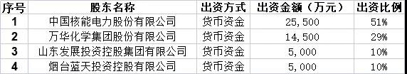 中国核电拟与万华化学、山东发展和烟台蓝天控股共同出资设立山东核能,其中公司拟出资25,500万元,持有山东核能51%股权。股权结构: