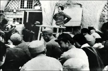 1937年7月,全国性抗日战争爆发后,大批爱国青年从全国各地来到革命圣地延安。一所抗大已不能满足需要,为了把大批爱国青年培养成为优秀的抗战干部,中共中央决定创办一所新的学校——陕北公学。毛泽东在繁重的工作中,时常对学校的任务、办学方针等关键问题给予及时的指导。毛泽东对陕北公学有很高的评价,他说:“中国不会亡,因为有陕公”。图为陕北公学学生听毛泽东作报告。