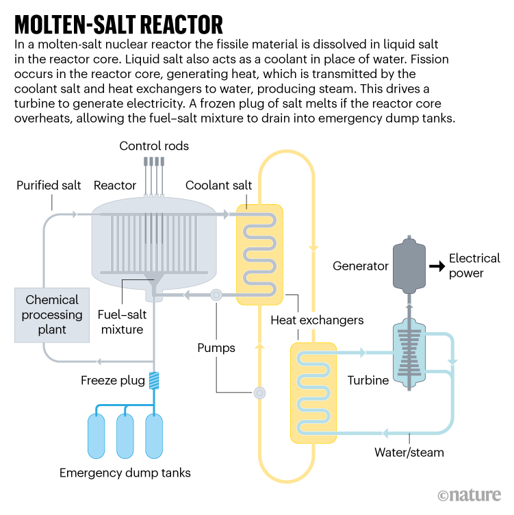 该反应堆的不同寻常之处在于它内部循环的是熔盐而不是水。它有可能生产相对安全和廉价的核能,同时产生的极长寿命的放射性废物比传统反应堆少得多。