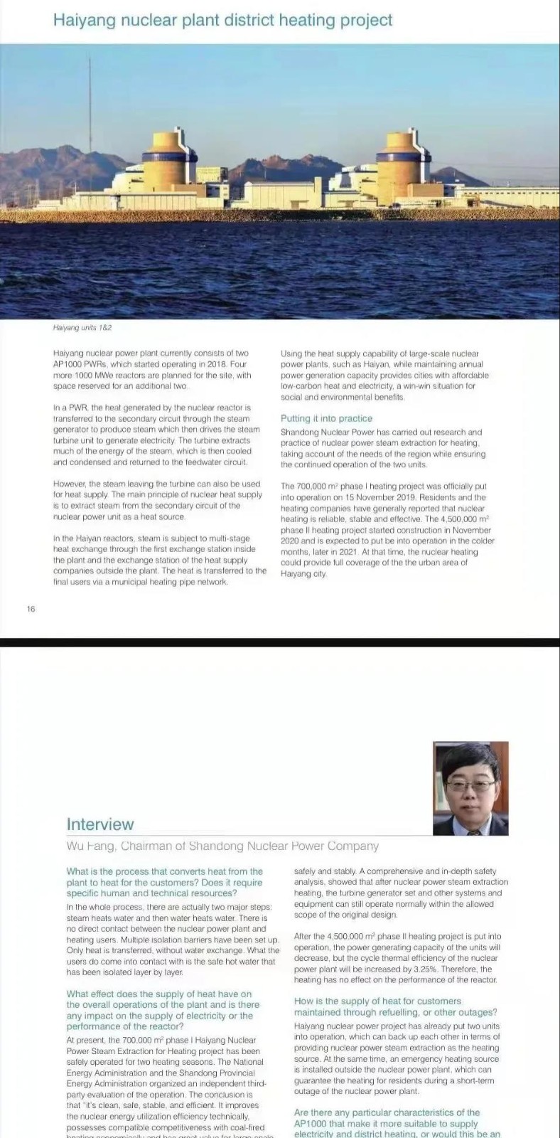 “海阳核能供热”案例是全球在“利用核能实现碳减排”方面的良好实践,简述了海阳核电项目情况,详细介绍了海阳核能供热原理,海阳核能供热一期70万㎡及二期450万㎡项目情况及目前取得的效果等内容。报告提出,“海阳核电厂为城市提供可负担的低碳电力和热力,实现了社会效益和环境效益的双赢”。