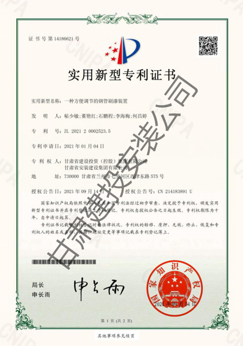 近日,由甘肃建投安装公司申报的“一种方便调节的钢管刷漆装置”获批国家实用新型专利授权(证书编号第14186621号)。
