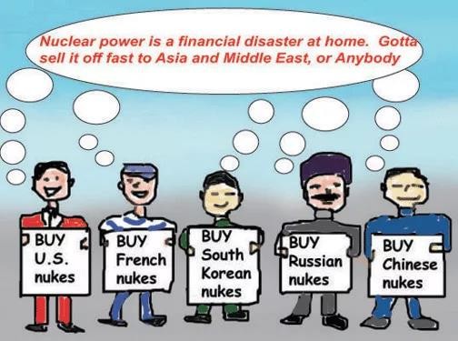 ④两种成本,两种结果,两类机型,分道扬镳。在市场竞标中,美、法机型,往往是先因其宣传的“先进”而占先,但后因其经济上的昂贵而败退,且是屡战屡败,几无新的订单。其开发商西屋、Areva,因无新项目入账,相继爆发财政危机,破产重组。与此相反,俄、中、韩则喜讯不断,特别是俄罗斯不时有新建设项目订单收入囊中。