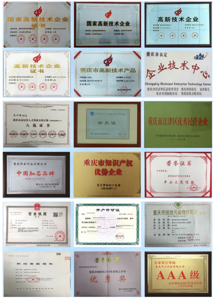 公司先后荣获中核集团合格供应商、2014年国家高新技术企业证书、2014年国家高新技术企业、2017年高新技术企业、2017年高新技术企业证书、2018年重庆市高新技术产品、重庆市认定企业技术中心、2012年重庆市江津区优秀民营企业、2009年中国知名品牌、2020-2023重庆市知识产权优势企业、中山火灾捐款荣誉证书、2009年企业资信AAA级企业等多项资质和荣誉,成为重庆名牌企业。
