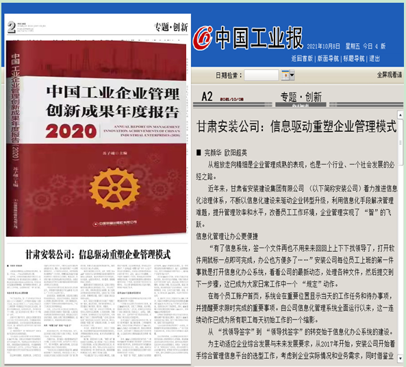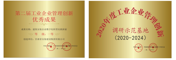 会上审定发布了中国工业企业管理创新大会暨第二届创新示范基地、优秀成果和优秀论文结果,由甘肃建投安装公司推荐的《建筑安装企业数字化转型实践探索》管理创新成果喜获一等奖,同时安装公司被认定为2020年度工业企业管理创新调研示范基地。