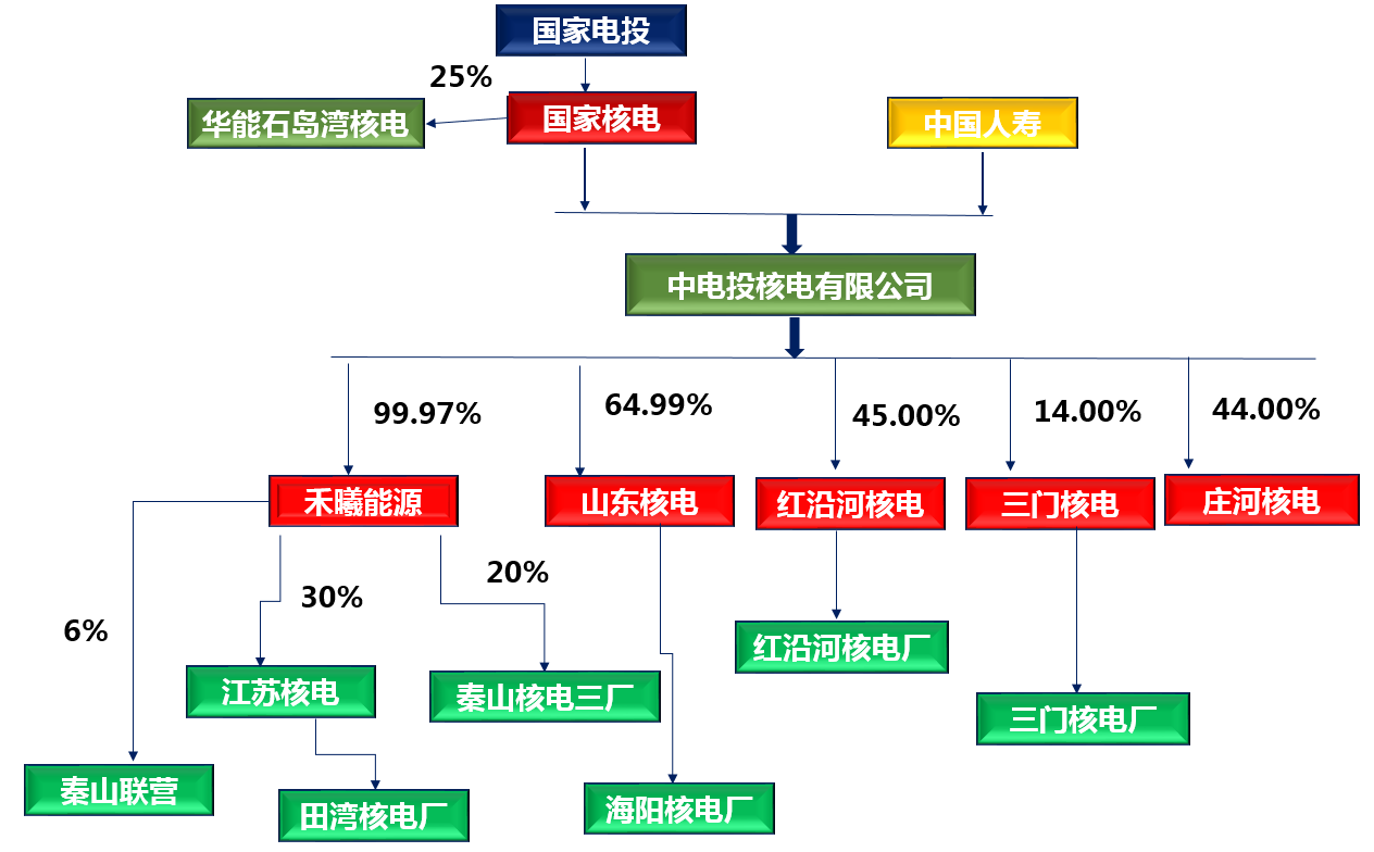 据查询,国家电投100%控股上海禾曦能源投资有限公司(简称“禾曦能源”),通过后者分别持有第三秦山核电有限公司(简称“秦山核电三厂”)、江苏核电有限公司(简称“江苏核电”)和核电秦山联营有限公司(简称“秦山联营”)20%、30%和6%股权,拥有秦山核电三厂、田湾核电厂和秦山核电二厂装机权益。