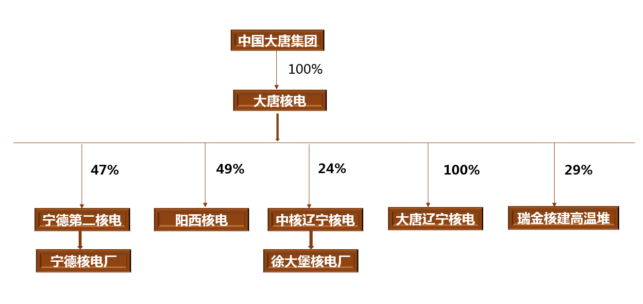 中国大唐集团进军核电的主体是中国大唐核电有限公司(简称“大唐核电”),其分别持有福建宁德第二核电有限公司(简称“宁德第二核电”)、阳西核电有限公司(简称“阳西核电”)、中核辽宁核电有限公司(简称“中核辽宁核电”)47%、49%和24%股权,拥有宁德核电厂、阳江核电厂和徐大堡核电厂的装机权益。